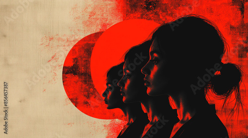 Three women are shown in a red and white background. The image has a dark and moody feel to it, with the red