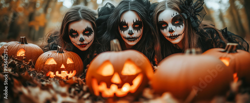 Three women in skeleton makeup with jack-o-lanterns in a forest