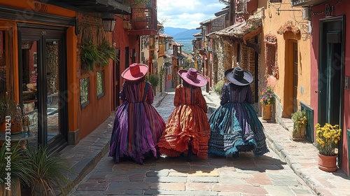 Three Women in Traditional Dresses Walking Down a Colorful Street in San Miguel