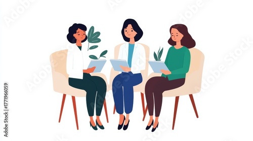 Three Women Meeting with Notebooks and Plants, Teamwork, Collaboration