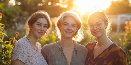 Three Women Posing for a Sunset Garden Photograph