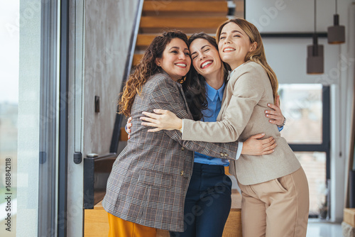 Three Women Sharing a Warm Hug In a Modern Living Space