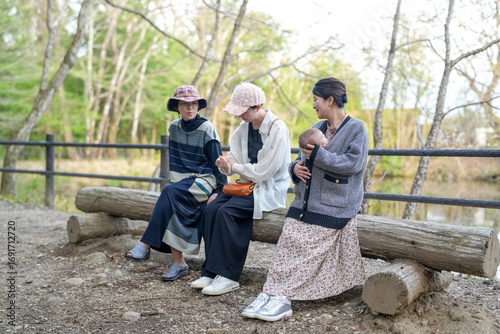 Three women sit on a log in a park, one of them holding a baby. Scene is peaceful and relaxing, as the women enjoy each other's company and the natural surroundings