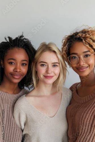 Three women with different hair colors and one wearing glasses