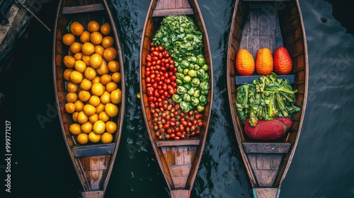 Three wooden boats filled with vibrant fruits and vegetables on a calm water surface.