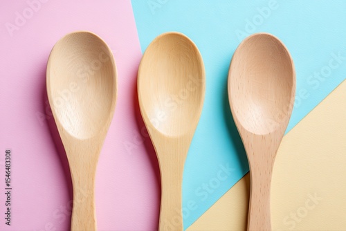 Three wooden kitchen spoons arranged on a pastel blue and pink background, creating a soft and inviting aesthetic.