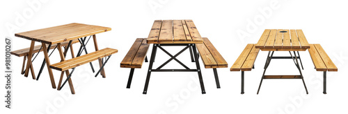 Three Wooden Picnic Tables with Metal Frames on Transparent Background