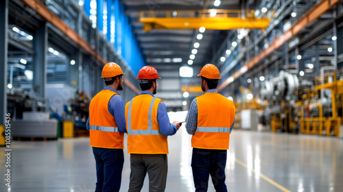 Three workers in safety vests and helmets inspect a manufacturing facility, showcasing teamwork and industrial environment.