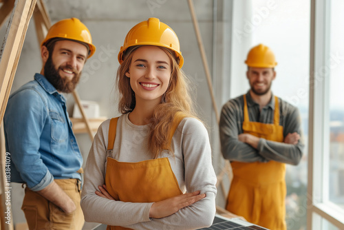 Three workers wearing yellow hard hats and overalls, standing in front of wooden structures with a large window in the background, highlighting teamwork and gender diversity in construction or enginee