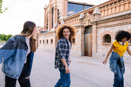 Three young friends are roller skating down a city street, laughing and enjoying the afternoon sun