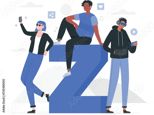 Three Young People Interacting with Technology and Social Media Icons friends
