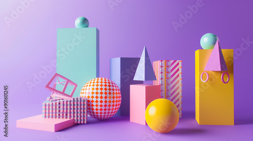 Three-dimensional abstract geometric shapes against a purple backdrop.