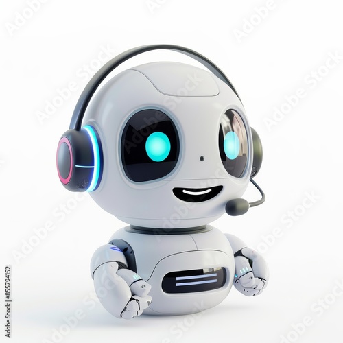 Three-dimensional modern illustration of a DJ robot chatbot wearing headphones