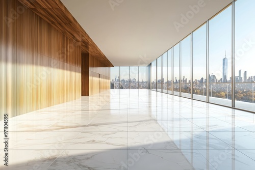 Three-dimensional rendering for car presentation on a blank concrete floor with city skyscraper tops visible through the metallic railing on a sunny day.