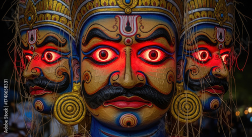 Three-faced Ravana mask with glowing red eyes and ornate details representing Hindu mythology and Dussehra festival celebration in India