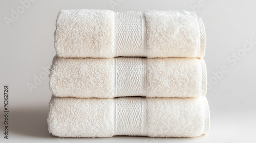 "Three-piece plush bath towel set isolated, featuring a close-up shot of woven terrycloth. Brand new hotel spa cotton towels with a beautiful design, including three 100% cotton ultra-absorbent terry