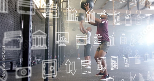 Throwing medicine balls four adults performing synchronized moves in fitness gym, with pull-up rigs