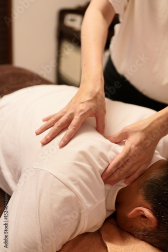 Thumb pressure massage around the shoulder blade