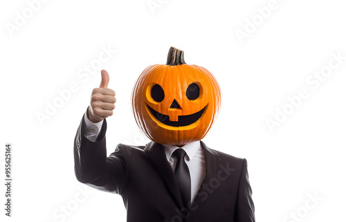 Thumbs Up from a Person in a Suit with a Jack-o’-lantern Pumpkin Head Photo, Isolated on Transparent Background, PNG