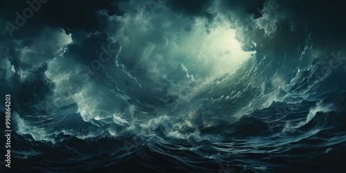 Thunderous waves crash as dark clouds loom ominously over the restless sea