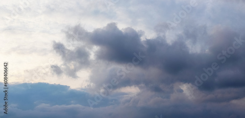 Thunderstormy sky with gray clouds, sunlight barely penetrates through the dark clouds