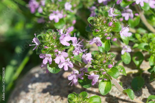 Thyme creeping (lat.Thymus serpyllum) blooms in the garden
