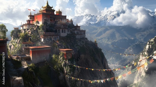 Tibetan monastery nestled in the valleys of the Himalayas, with a misty background and travelers visiting.