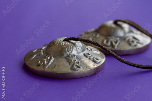 Tibetan Tingsha: a musical instrument with eight sacred symbols of wealth and well-being on the body with leather ribbon. Karatal on a purple background. Selective focus.