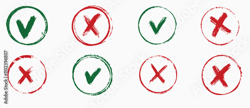 Tick and cross signs, hand drawn brush strokes, vector, isolated.