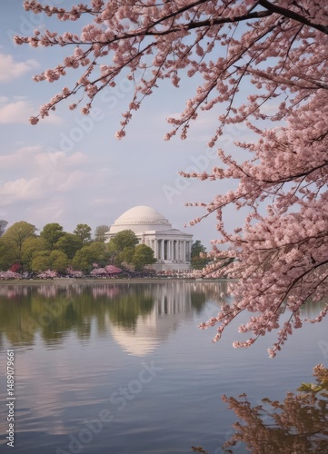 Tidal Basin, Jefferson Memorial, full bloom cherry trees, blossom, flowers, view