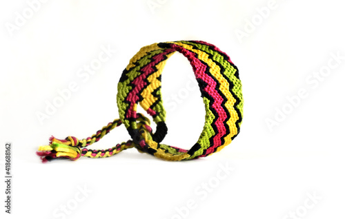 Tied DIY friendship bracelet with bright colorful pattern handmade of thread on white background