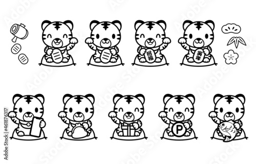 かわいいトラの招き猫セット(白黒) tiger beckoning cat vector illustration.