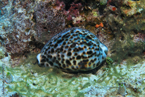 Tiger cowrie snail underwater in the coral reef