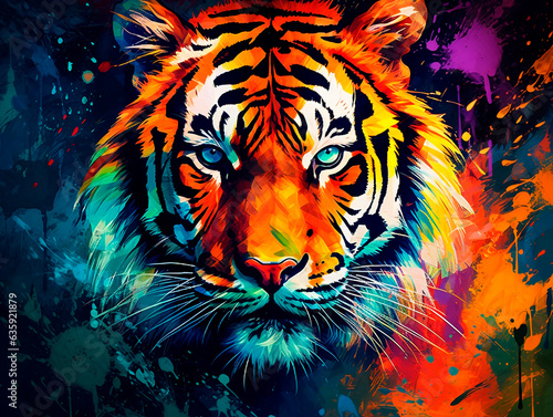 Tiger head with colorful splashes on grunge background, vector illustration