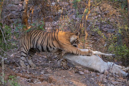 Tiger in the nature habitat. Tiger male walking head on composition. Wildlife scene with danger animal. Hot summer in Rajasthan, India. Dry trees with beautiful indian tiger, Panthera tigris