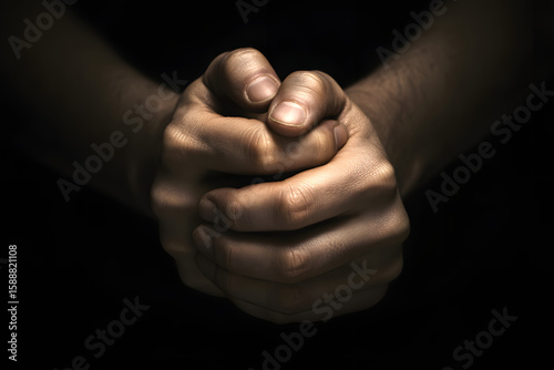 Tightly clasped hands convey stress and anxiety against a dark background, suggesting tension and emotional pressure.