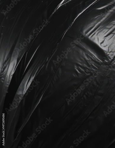 Tightly-packed wrinkles, shiny plastic, stark contrast against black, dark, studio, surface
