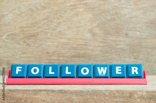 Tile alphabet letter with word follower in red color rack on wood background