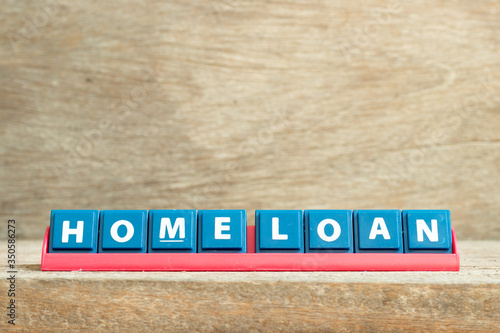 Tile letter on red rack in word home loan on wood background
