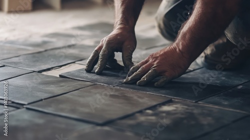 Tile setter placing ceramic tiles on a floor. Featuring precision and craftsmanship