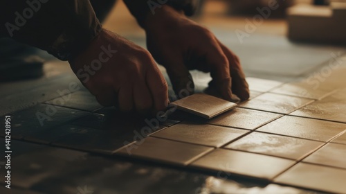 Tiler cutting ceramic tiles for a bathroom floor. Featuring precision and craftsmanship