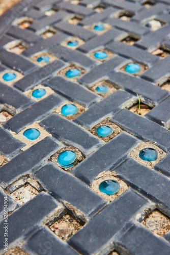 Tilted view of black brick path with every other pattern of varying and missing blue marble stones