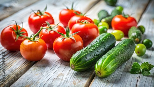 Tilt-Shift Photography: Fresh Cucumbers & Tomatoes on White Wood - Vibrant Summer Produce