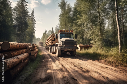 Timber Carrier Cutdown Tree Logs By The Road In The Forest, Generative AI