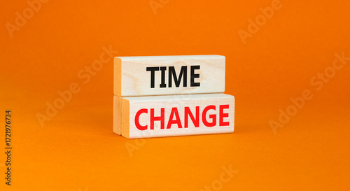 Time change symbol. Concept word Time change on beautiful wooden blocks. Beautiful orange paper background. Business time change concept. Copy space.