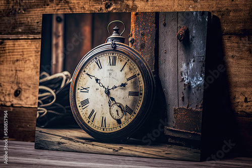 Time concept. Old rustic wall clock on old wooden table , generative artificial intelligence