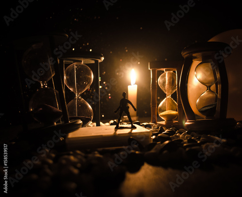 Time concept. Silhouette of a man standing between hourglasses with smoke and lights on a dark background.