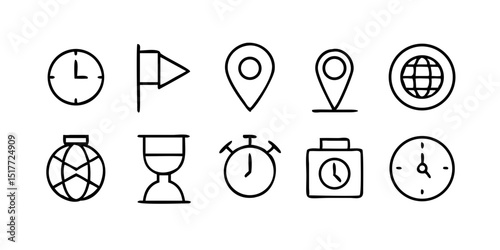 Time, date and location icon set in line style, Containing hourglass, pin, stopwatch, calendar, clock, gps point, flag point, globe point and more, vector illustration