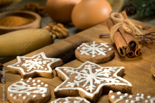 Time for Christmas baking. Recipe Christmas gingerbread. Culinary background. on the table laid out products for the preparation of cookies.