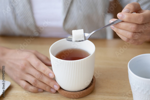 Time for tea. Close up of woman student employee taking short break in work preparing to enjoy hot drink at workplace. Young female holding lamp of sugar on teaspoon above cup of flavored tea blend